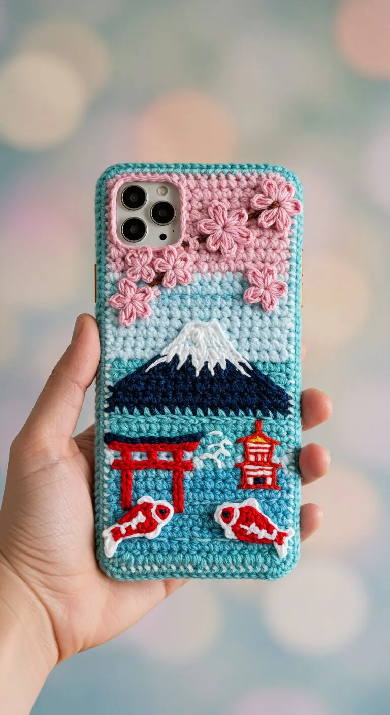 Are you captivated by the beauty of Japanese landscapes? Now you can carry a piece of that serene artistry with you everywhere you go! This guide will help you create a stunning, custom-fit crochet phone case adorned with iconic Japanese elements: delicate cherry blossoms, majestic Mount Fuji, a traditional torii gate, a charming pagoda, and graceful koi fish.
