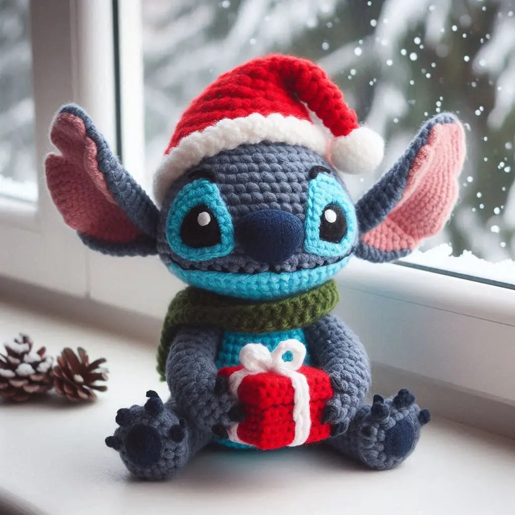 This adorable Stitch amigurumi in a Christmas outfit is the perfect way to bring some holiday cheer to fans of “Lilo & Stitch.” With his festive Santa hat, cozy green scarf, and a little red gift in his hands, Stitch is ready to celebrate the season in style. His expressive eyes and playful details make him an ideal holiday decoration or a thoughtful handmade gift for any Disney lover.