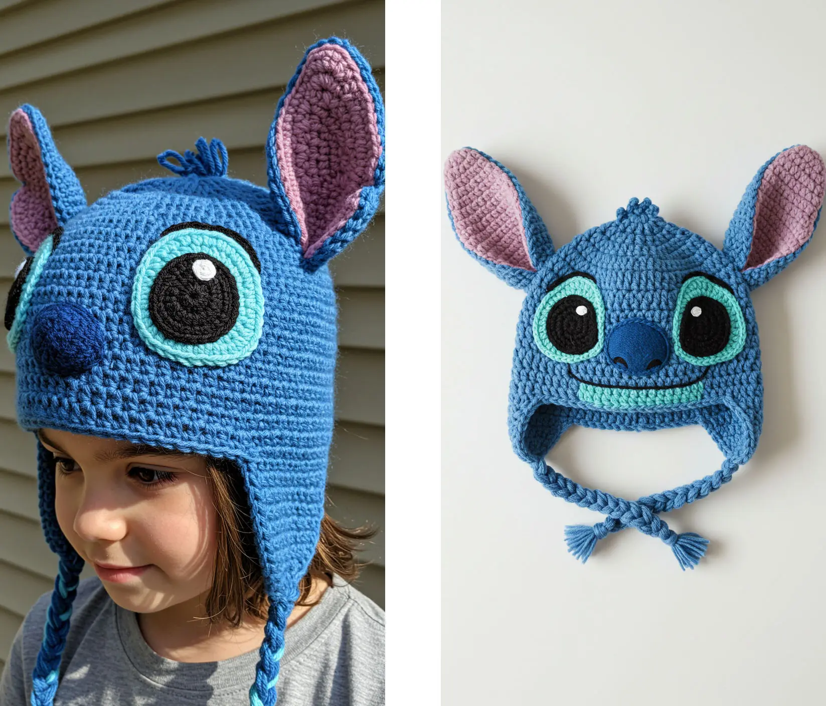 The Stitch Crochet Hat is typically made using vibrant blue yarn, with accents of black, white, pink, and turquoise to recreate Stitch’s unique facial features. The standout elements include large 3D ears, wide expressive eyes, and a rounded nose. Many versions include earflaps and braided ties to keep the hat secure and warm, making it both stylish and practical for cooler weather.