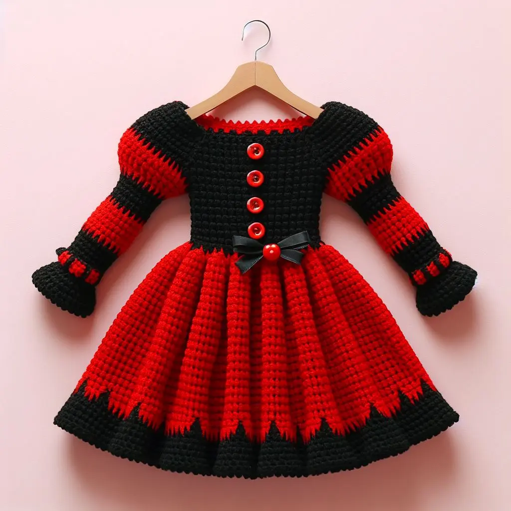 This adorable Halloween crochet dress is perfect for a festive occasion. Featuring striking black and red stripes, puffed sleeves, and decorative buttons, this dress is designed to stand out. With a flared skirt and intricate detailing, it is an excellent project for intermediate crocheters.