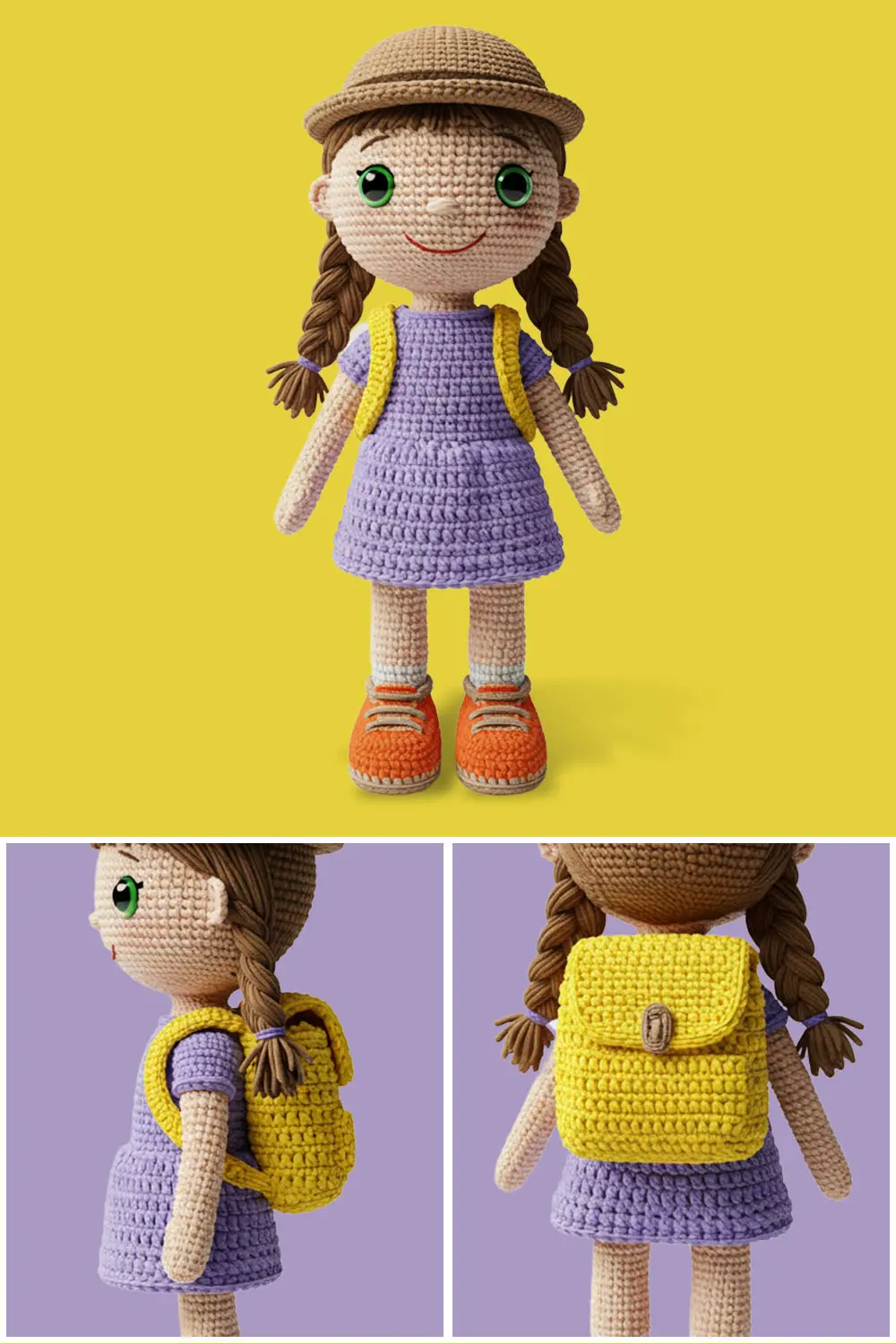 The Student Girl Crochet Amigurumi is the perfect representation of curiosity and learning. With her purple dress, glasses, and a cute yellow backpack, she’s ready for her first day of school or a visit to the library.