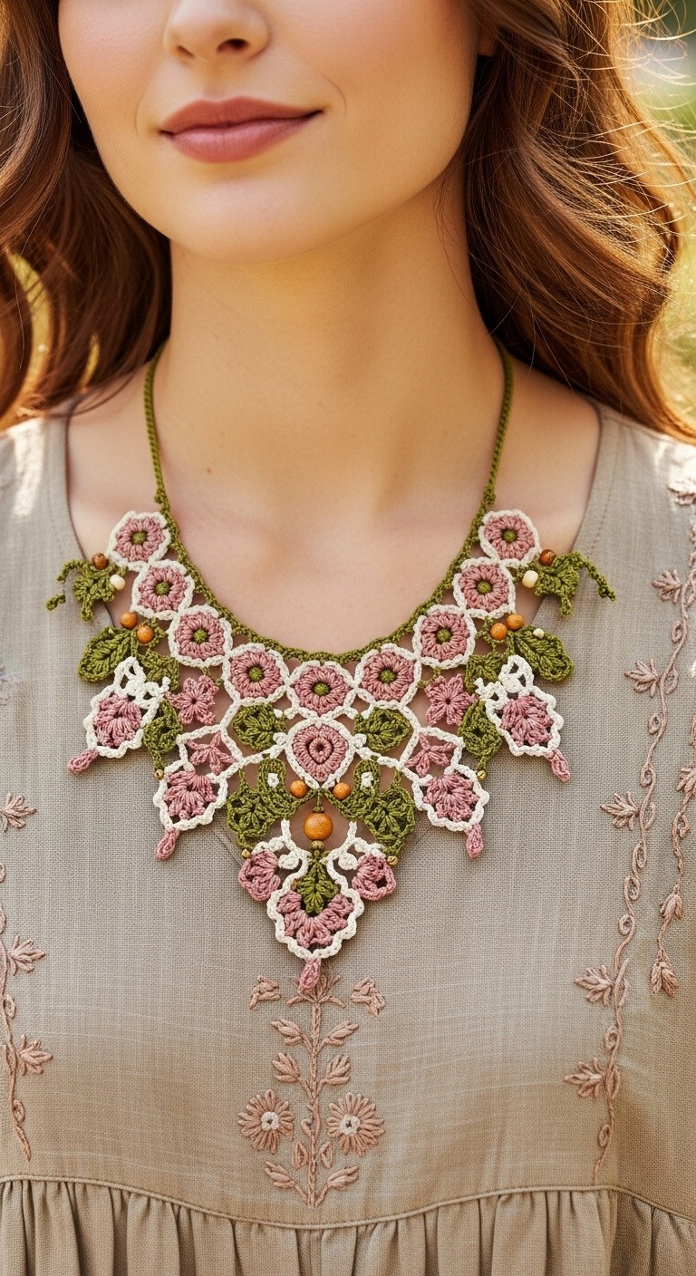 Unleash your inner artist with our stunning Floral Crochet Necklace Pattern! This exquisite design, reminiscent of delicate lacework and bohemian charm, transforms simple threads into a captivating statement piece. Adorned with dusty rose blossoms, olive green leaves, and subtle wooden beads, this necklace brings a touch of handcrafted elegance to any outfit. Perfect for adding a unique, nature-inspired accessory to your collection or gifting to a loved one.