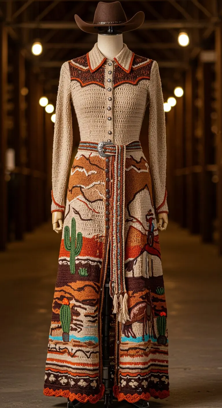 Crochet meets cowboy flair in this captivating collection of handcrafted Western dresses. Drawing inspiration from the rustic charm of rodeos, country landscapes, and cowboy culture, these dresses celebrate texture, detail, and tradition. Each look features intricate crochet work blended with Western motifs, creating a unique fusion of classic Americana and artisanal craftsmanship.