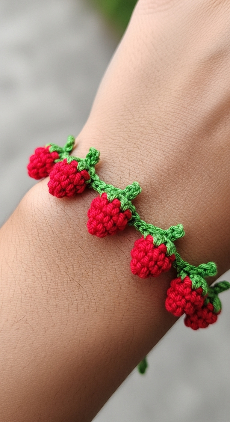 A delightful and charming accessory perfect for adding a touch of handmade sweetness to any outfit. This crochet bracelet features a series of vibrant red strawberries, each adorned with tiny green leaves, all connected by a delicate green chain. It’s a fun and quick project, ideal for summer days or as a thoughtful gift for a loved one, showcasing the beauty of handcrafted jewelry.