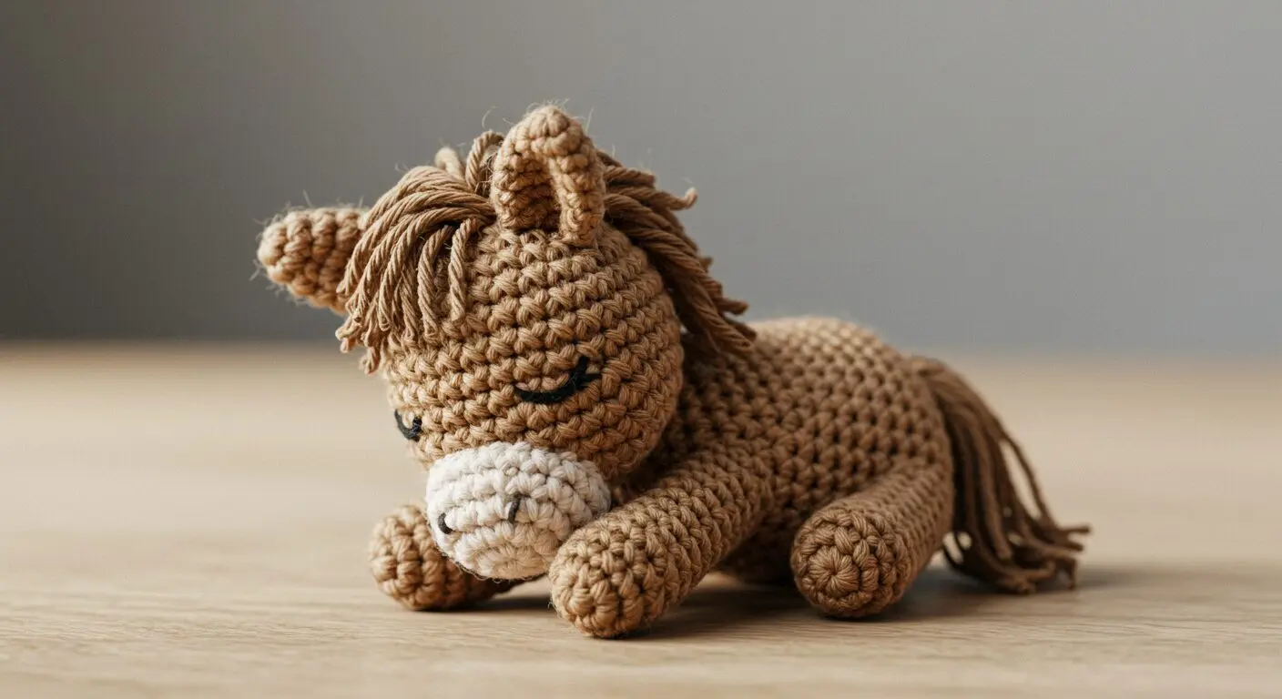 This piece uses a smooth beige yarn for the body, with a brown mane and tail created through layered yarn loops for added volume. The horse’s compact form is achieved with dense single crochet stitches, and the closed eyes are carefully embroidered to give a serene, sleeping look.