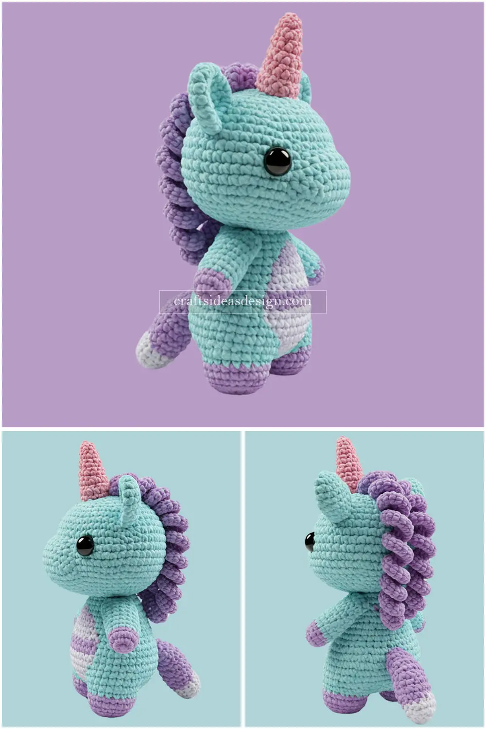 The magical Unicorn Crochet Amigurumi features a pastel blue and purple color scheme with a bright pink horn. It’s a dream come true for fantasy lovers.