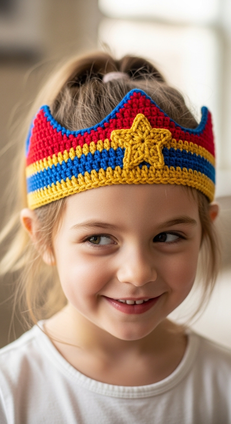 Craft a mighty accessory! This easy crochet pattern lets you create a vibrant Wonder Woman crown headband, perfect for dress-up, costume parties, or just adding a touch of superhero magic to any day. Designed for confident beginners, it’s a fun and quick project that will make any child feel like a true hero.