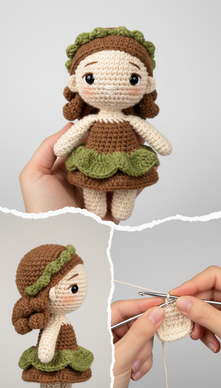 Step into a magical woodland with our enchanting Forest Fairy Amigurumi Doll! This detailed crochet pattern will guide you through creating your very own whimsical companion, complete with flowing brown curls, a ruffled olive green dress, and an irresistible charm. Perfect for adding a touch of fantasy to any collection or as a cherished handmade gift.