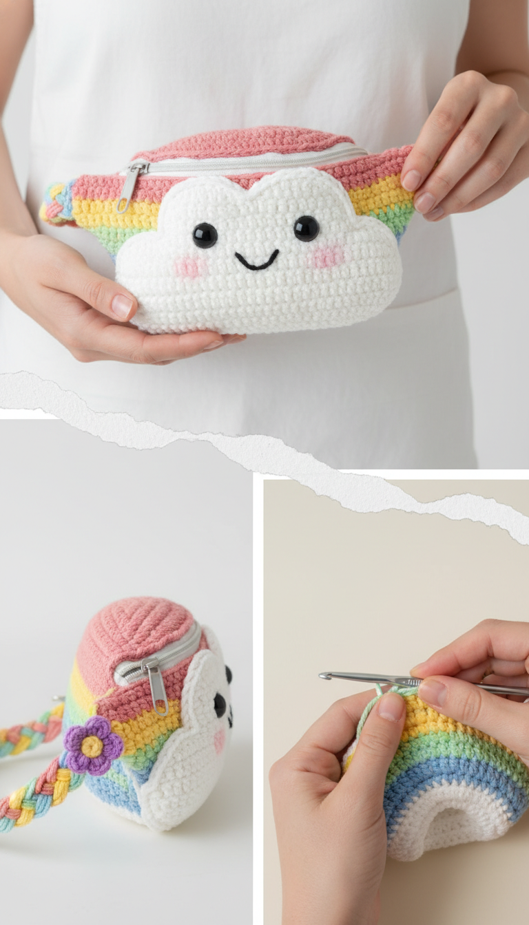 A whimsical accessory that brings a splash of joy to any outfit! This adorable crochet rainbow cloud fanny pack is perfect for holding your essentials while adding a touch of playful charm. Handmade with love, it features a smiling cloud face and vibrant rainbow stripes, making it a unique and eye-catching piece. Follow our detailed pattern to create your own delightful waist bag!