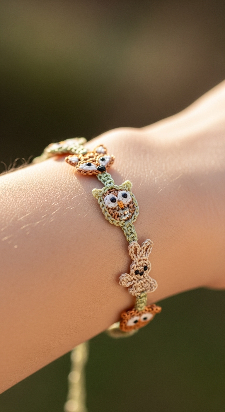 Embark on a delightful crochet adventure with this enchanting Woodland Whimsy Charm Bracelet! Featuring an adorable cast of forest friends – a wise owl, a cunning fox, and a playful bunny – this accessory captures the gentle spirit of nature. Each tiny amigurumi animal is meticulously crafted and linked by a delicate green vine, creating a truly unique and heartwarming piece.